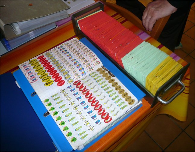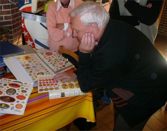 Une fois l'assemblée au complet ce fut un véritable déchainement légufrulabélophile, chacun amenant par son expérience personnelle une pierre à l'édifice légufru. Nous sommes par contre tous restés en admiration devant l'énergie déployée par Maryvonne qui passe plusieurs heures par jour, et probablement la nuit, à gérer son immense collection (Plus de 37000 etiquettes !!!). Elle avait amené un des 62 petits cahiers d'écolier qui abrite sa collection, son classeur destiné aux expositions et ses fiches. Un travail titanesque, herculéen, qui laissa pantois la totalité de ce cercle d'initiés, car elle travaille à l'ancienne sans informatique.