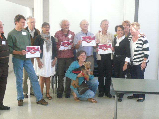A 16 heures les corps et les cerveaux chauffaient et le pompier dut intervenir pour annoncer une pause pour réaliser la photographie de groupe et proposer le visionnage d'un petit film sur la fabrication des étiquettes et l'étiquetage des fruits. (remerciements à la société Euro-label 06).