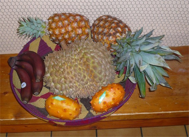 Afin de mettre du piquant dans cette folle journée il était prévu une dégustation de quelques fruits exotiques : ananas, bananes roses, kiwanos et clou du spectacle un durion. La dégustation de ce dernier fruit, très appécié des asiatiques, laissa dubitatif la quasi totalité de l'assemblée, exceptée Laurence. Il faut assuremment être né à Pékin ou à Hanoï pour en apprécier toutes les subtilités. Il faut aussi préciser que ce fruit sent affreusement mauvais. Enfin, soyons clair il pue !