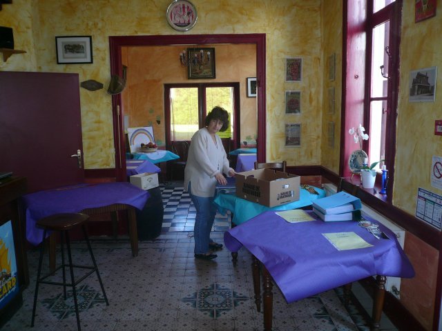 Dès 9 heures 30 les organisateurs sont à pied d'œuvre pour préparer les deux salles qui vont recevoir une horde de sauvages chasseurs d'étiquettes. Il faut remodeler l'espace, bouger les tables, assurer une bonne circulation entre les collectionneurs. Un soin particulier est apporté à la décoration afin de créer les éléments nécessaires à la convivialité et au bien-être de tous.