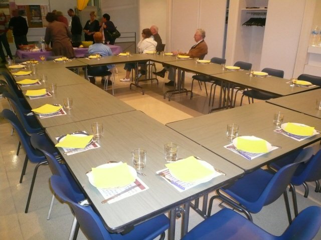 Dès 10 heures les cinq organisateurs (Laurence, Denise, Gérard, Gabriel et Didier) sont à pied d'œuvre et débordent d'énergie pour mettre en place la salle, installer les tables, les chaises, la décoration et la signalétique.
