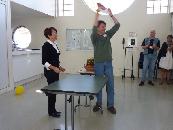 A 16 heures les corps et les cerveaux chauffaient et le pompier dut intervenir pour annoncer une pause pour réaliser la photographie de groupe et proposer le visionnage d'un petit film sur la fabrication des étiquettes et l'étiquetage des fruits. (remerciements à la société Euro-label 06).